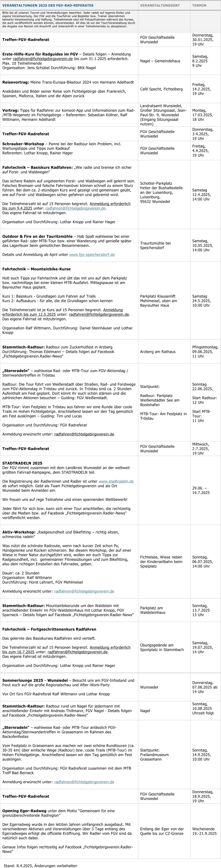 Willkommen im Bereich Radfahren des Fichtelgebirgsvereins Radfahren wird immer beliebter. Auch im FGV gibt es seit vielen Jahren diverse Radangebote, die über unsere Ortsvereine angeboten werden. Dieses Angebot bauen wir auch stetig aus, weshalb wir derzeit im Hauptverein ein Referat Radfahren aufbauen. Alle Interessierten können da gerne mitmachen. Hier wollen wir Euch/Ihnen nun zeigen, was Ihr mit dem FGV alles Schönes per Rad erleben könnt.